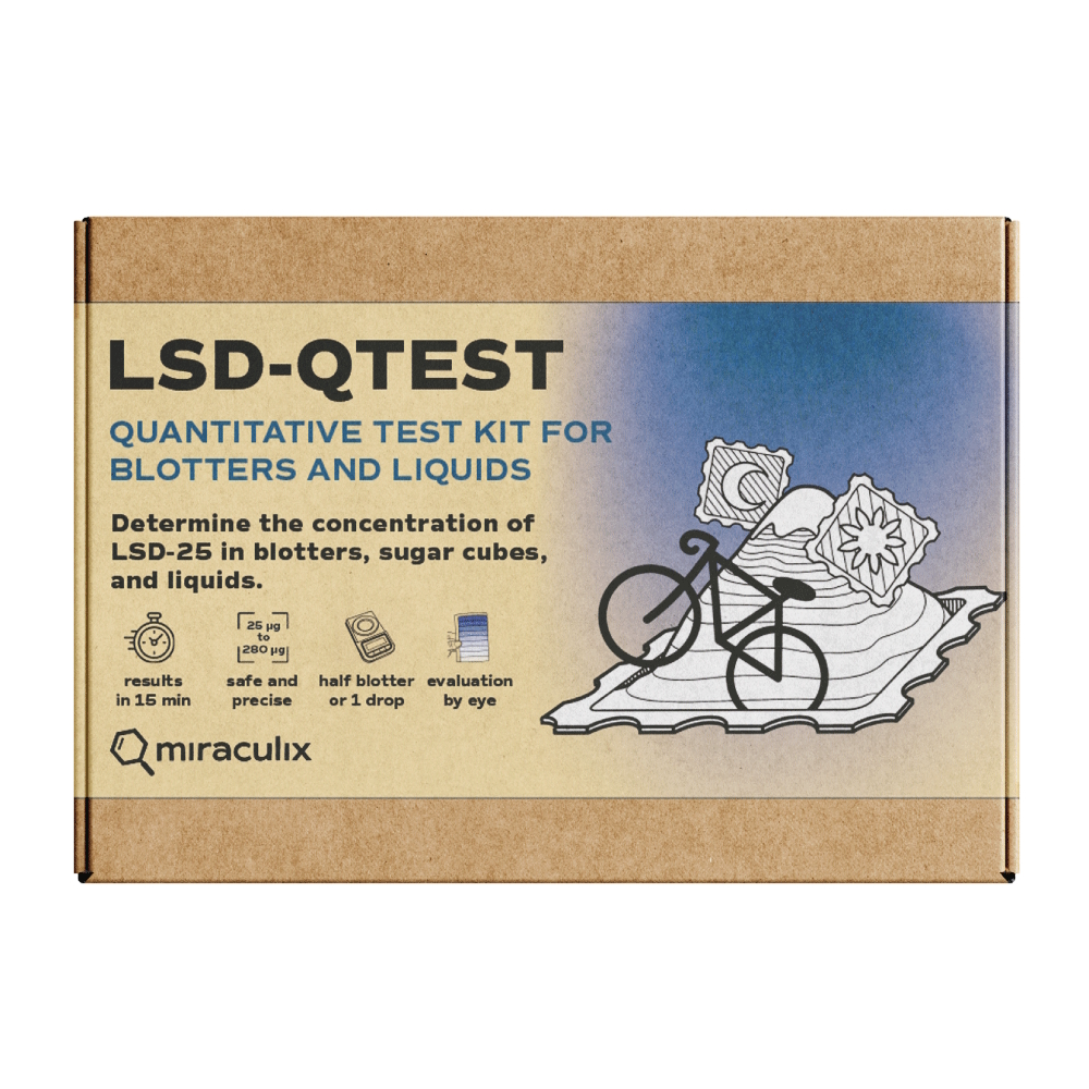 Med LSD QTest fra miraculix kan du enkelt måle konsentrasjonen av LSD i blottere og væsker på bare 15 minutter. Testsettet er kvantitativt, ikke bare kvalitativt: det forteller deg ikke bare om det er LSD tilstede, men hvor mye.
