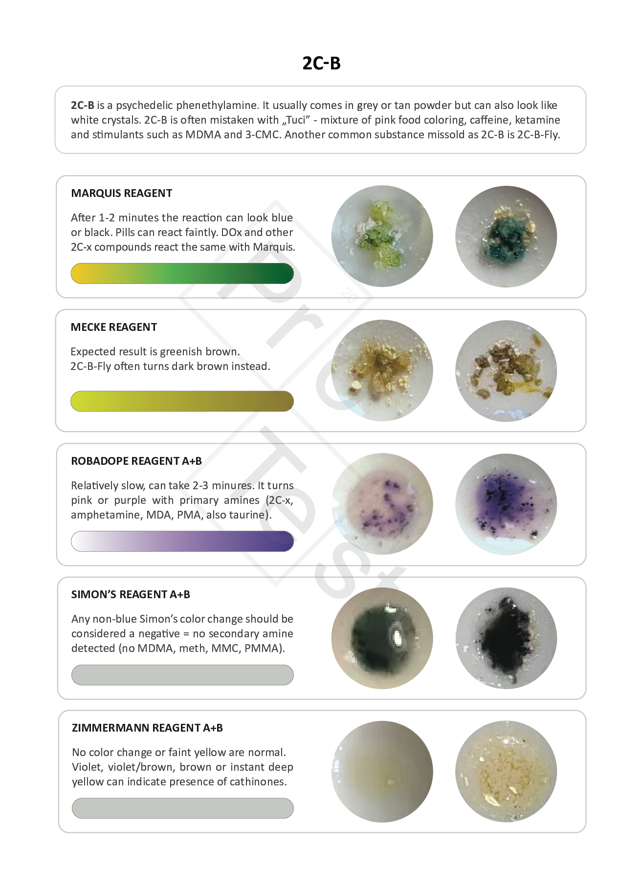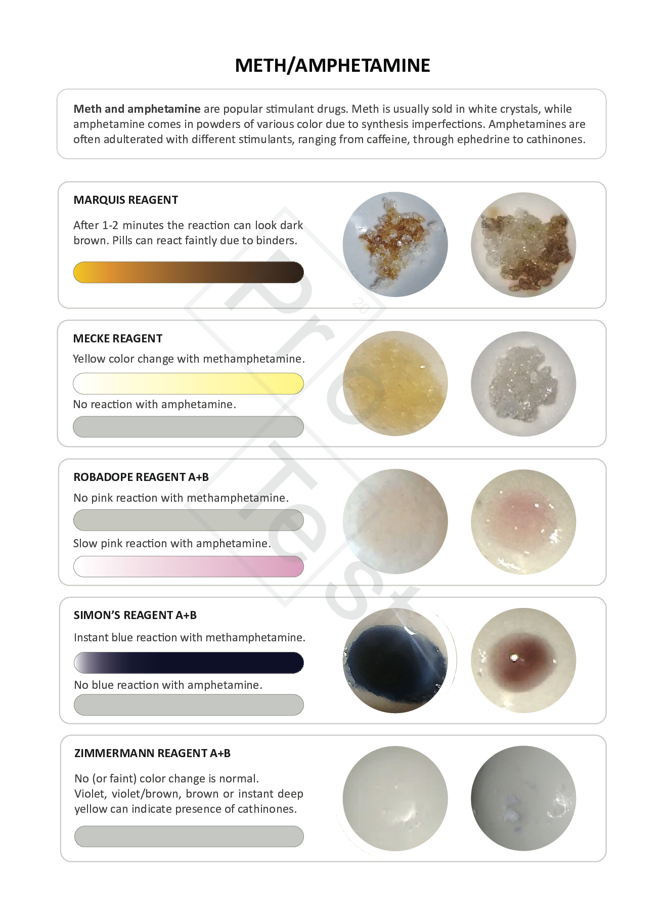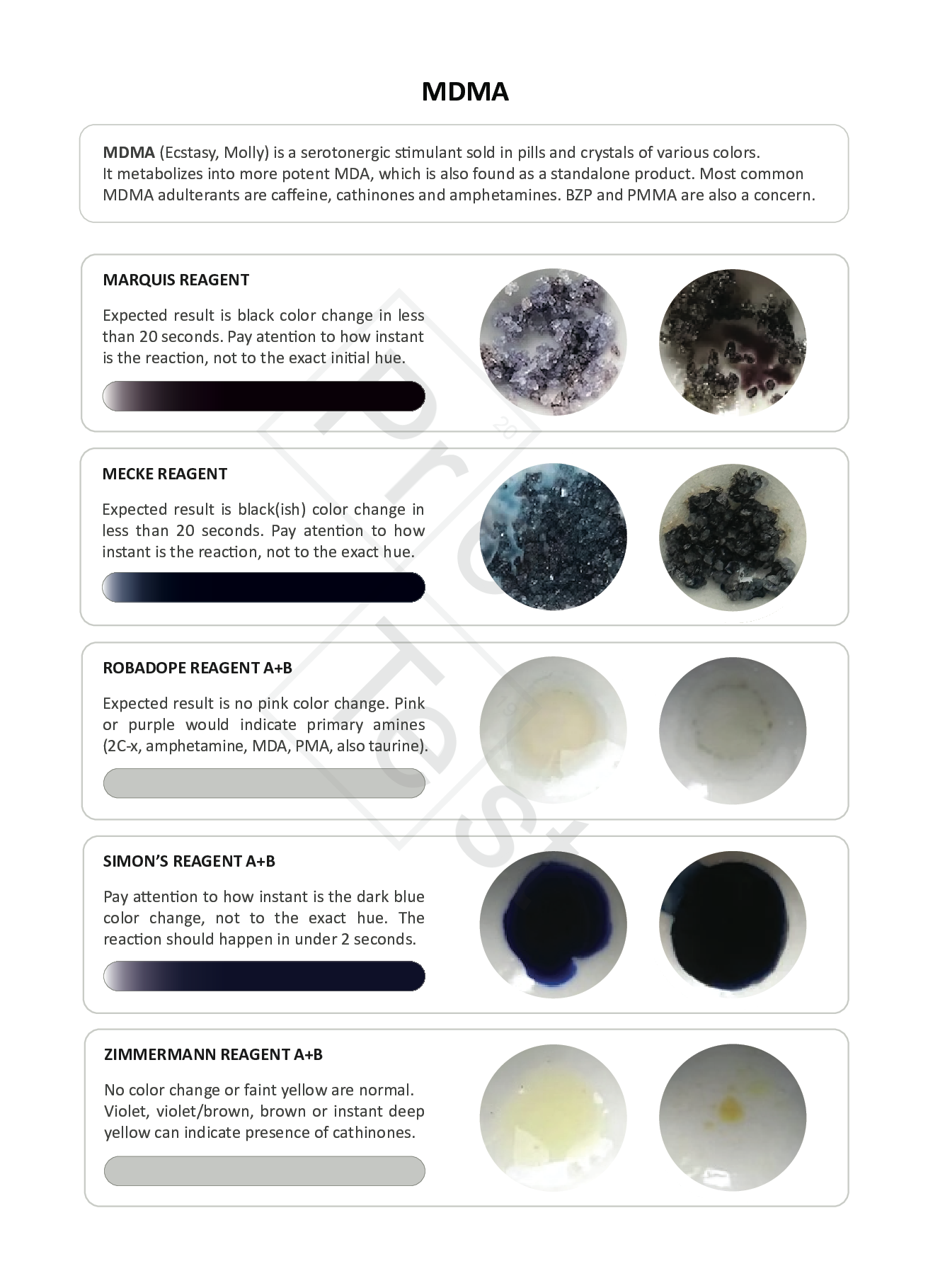Verdens beste testkit for MDMA, amfetaminer og 2C-B med fem testreagenser. Settet kan brukes til å påvise stoffer som MDMA, MDA, amfetaminer og 2C-B/C/H/I. I tillegg kan det sannsynligjøre tilstedeværelse/fravær av bl.a. syntetiske katinoner («cathinones»), PMA/PMMA og andre uønskede tilsetninger.
